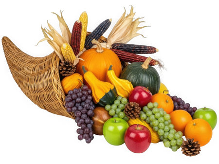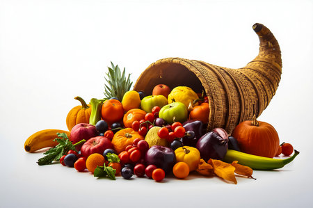 A cornucopia of fruits and vegetables on a white background, symbolizing abundance and harvest, perfect for thanksgiving celebrations..Generated AI.