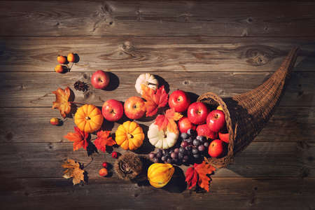 Thanksgiving cornucopia fill in fruit isolated wooden background in autumn and fall harvest season