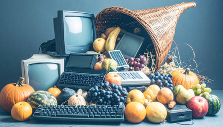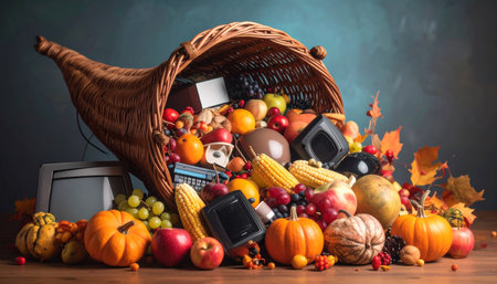 Thanksgiving ornate cornucopia, filled with a variety of seasonal fruits, vegetables and modern technology items