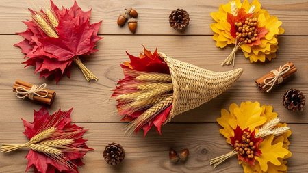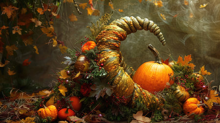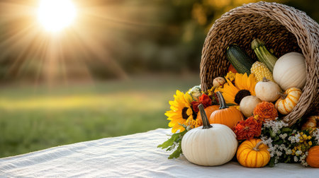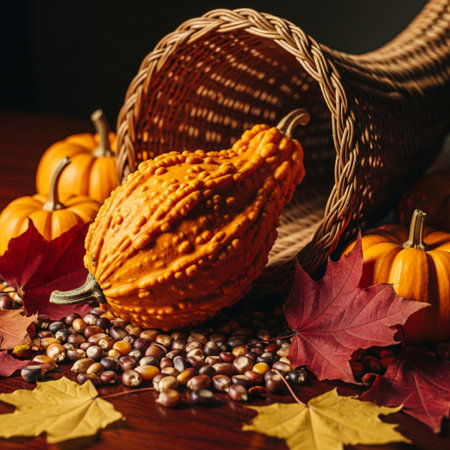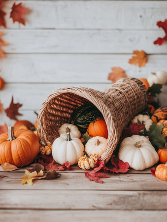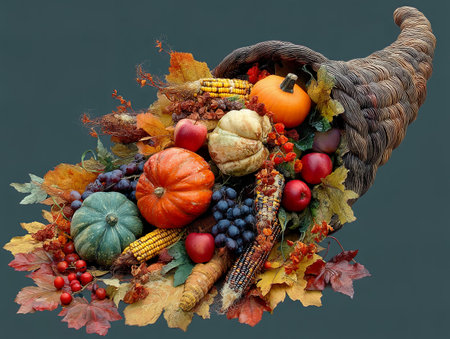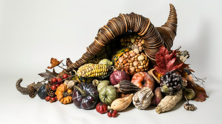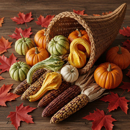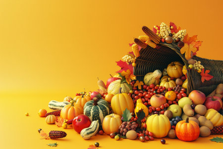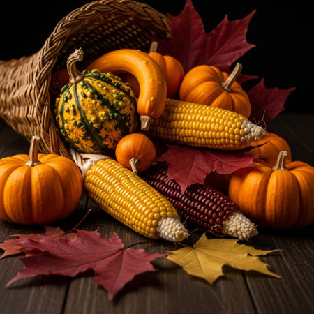 A vibrant cornucopia brimming with seasonal bounty showcasing pumpkins, corn, and autumn leaves, perfect for festive Thanksgiving decorations or gatherings.