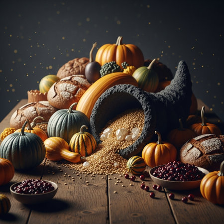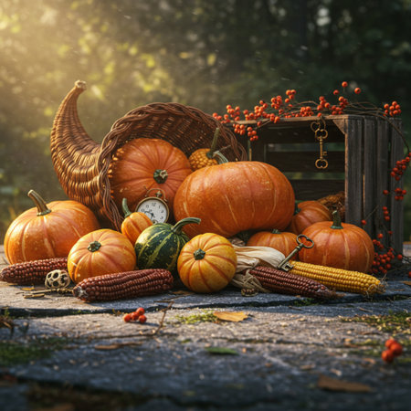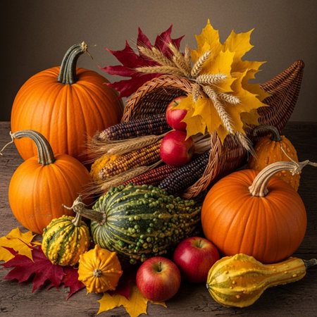 Vibrant harvest holiday with pumpkins, corn, and autumn decorations in a festive setting