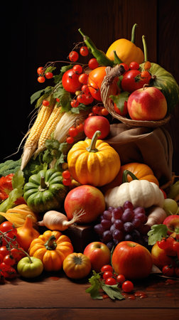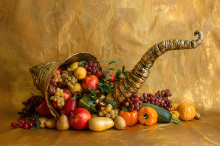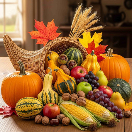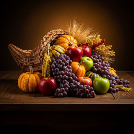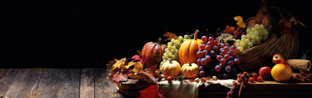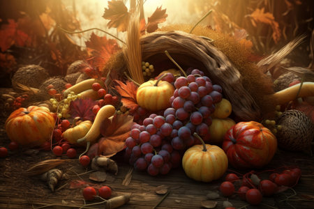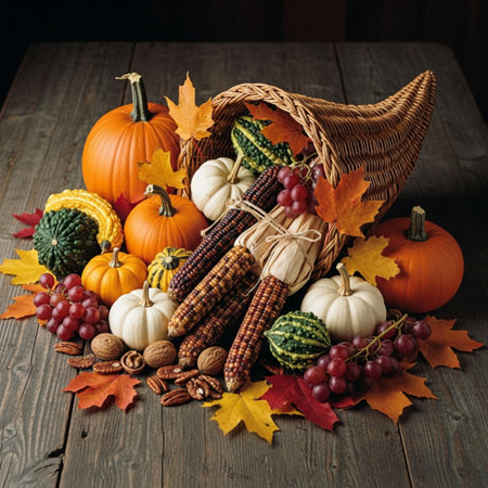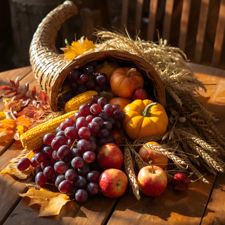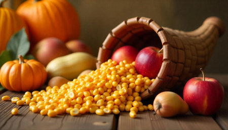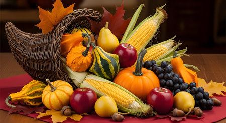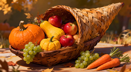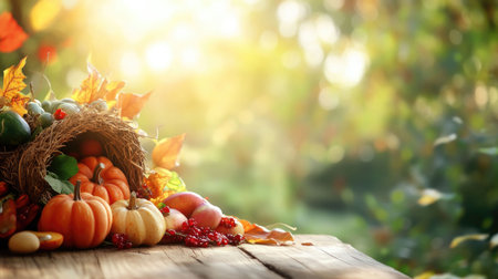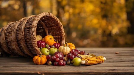 Thanksgiving and Harvest Festival. A rustic wooden table adorned with a cornucopia overflowing with autumnal fruits and vegetables, symbolizing the abundance and blessings associated with Thanksgiving