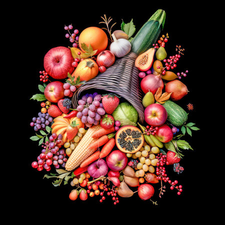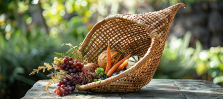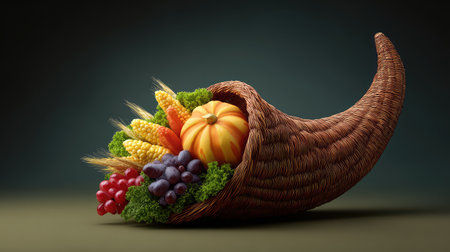 A colorful arrangement of fruits and vegetables spilling out of a wicker horn, symbolizing abundance and harvest.