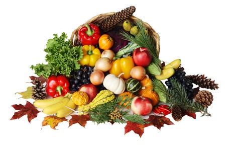 Traditional cornucopia filled with fruits and vegetables, open area on right side