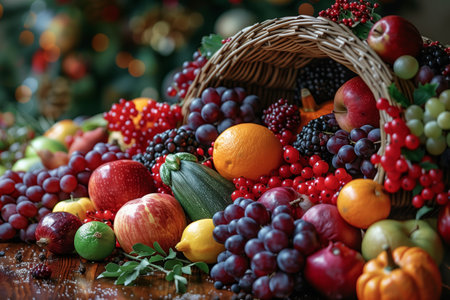 Bountiful Harvest Display of Fresh Fruits in a Rustic Basket Surrounded by Holiday Cheer