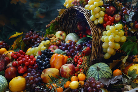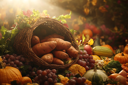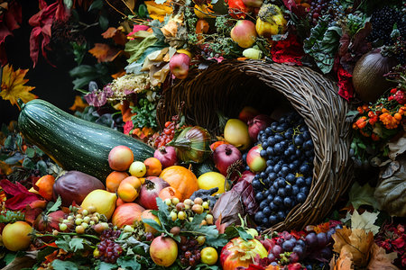 Wicker basket overflowing with a cornucopia of fresh fruits and vegetables for a festive thanksgiving celebration