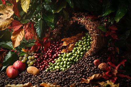 A beautifully arranged cornucopia filled with vibrant autumn pumpkins, colorful leaves, and bright berries, capturing the essence of fall celebrations.