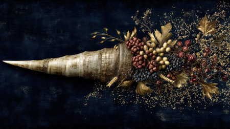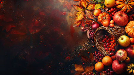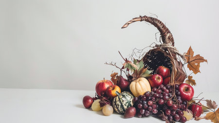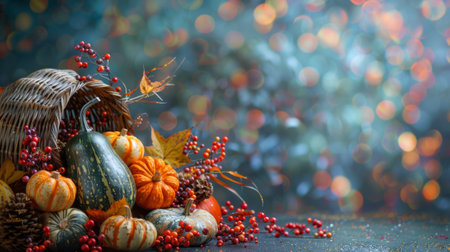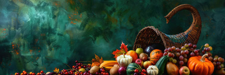 thanksgiving cornucopia, thanksgiving banner featuring a cornucopia filled with gourds, squash, and berries, symbolizing gratitude and abundance, with space for text