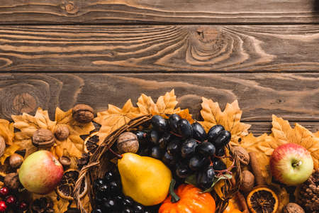 top view of autumnal harvest in basket on foliage on brown wooden background