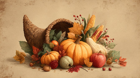 A cornucopia filled with fresh vegetables and pumpkins, radiating warmth
