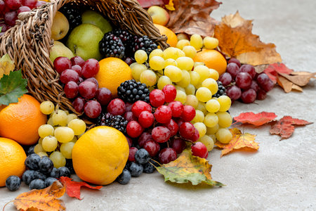 A beautiful cornucopia filled with vibrant fruits and autumn leaves, perfect for celebrating the harvest season.