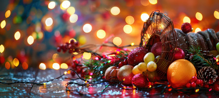 Festive Cornucopia with Sparkling Holiday Decorations and Seasonal Fruits for Christmas