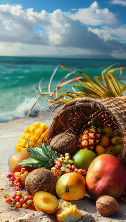 Tropical Abundance: A Cornucopia of Exotic Fruits on a Sandy Beach
