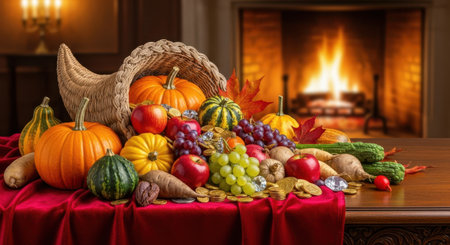 A bountiful cornucopia spills forth with a rich assortment of ripe autumn fruits and vegetables, set against the warm glow of a crackling fireplace, evoking a sense of abundance and harvest.