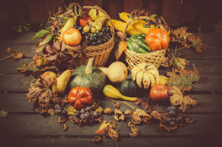 Autumn and Thanksgiving concept. Seasonal fruit and pumpkins in basket on wood background.
