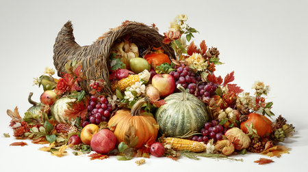Thanksgiving cornucopia harvest autumn fall festive food assortment abundance seasonal decor. Pumpkin corn apple pear grapes squash leaves table arrangement holiday celebration. AI Generative AI generated