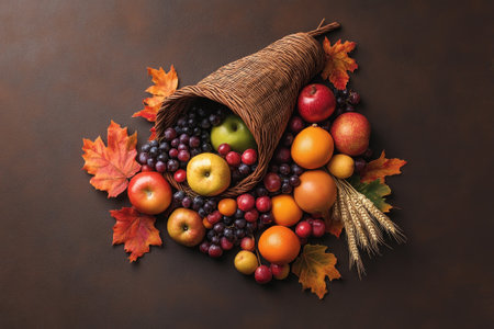 A festive arrangement of fruits spilling from a woven cornucopia on a rustic background, symbolizing abundance and harvest.