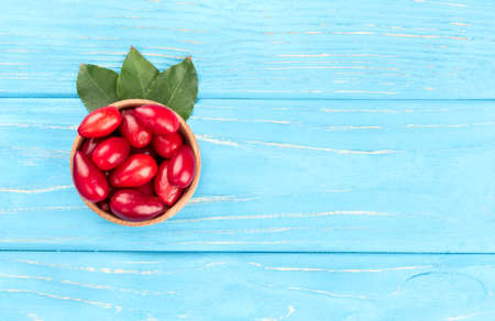 Little bowl with cornel and leaves on the table, top view