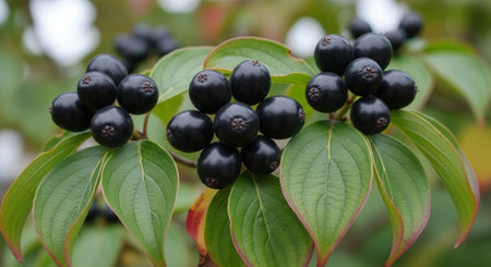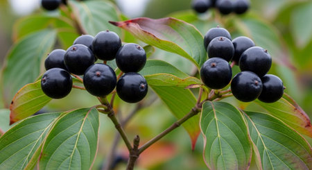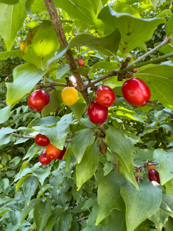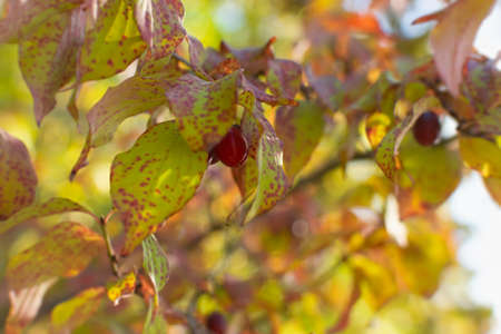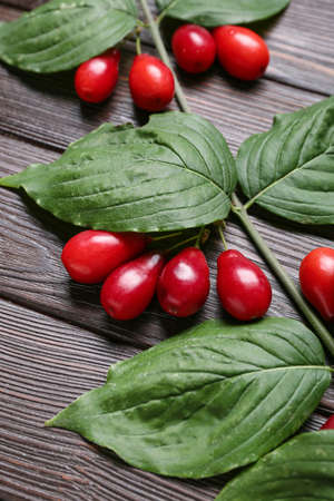 Cornus mas branch close up with ripe fruits