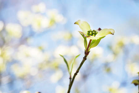Dogwood (Cornus) blooming in the Spring in the forest. Beautiful flowers in a european garden in different colors