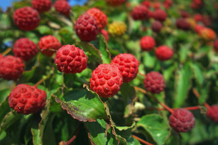 Kousa, kousa dogwood, Chinese Korean Japanese dogwood. Close up of bright red autumn fruit on Cornus kousa tree in garden