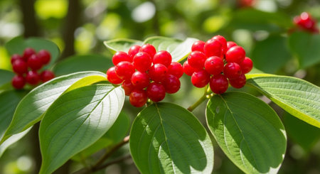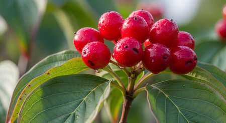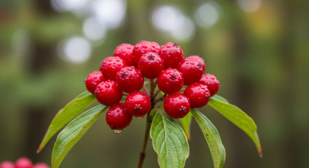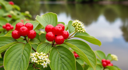 Photo of a branch of a red dogwood berry on a background of foliage