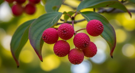 Cornus mas or common red dogwood. autumn wild berries on the branches of a shrub. Natural bright background with bokeh copy space. Harvesting in autumn. Natural vitamins, healthy fruits in soft focus