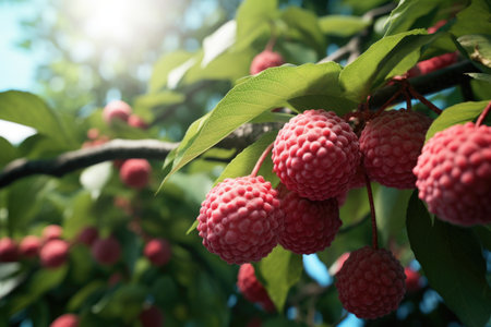 Ripe lychee growing on a tree on a sunny day
