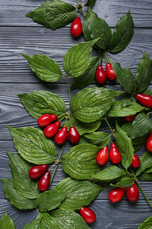 Branch with fresh dogwood berries on black wooden background, closeup
