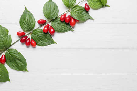 Branches with ripe dogwood berries on white wooden background