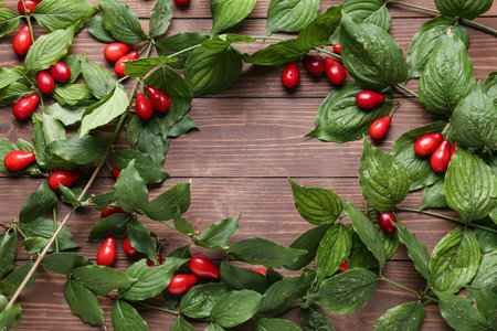 Frame made of branches with fresh dogwood berries on wooden background