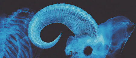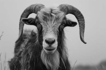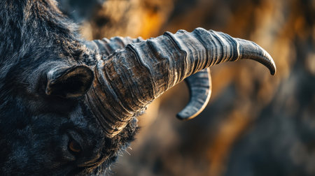 A goat with large horns stars at the camera. The image has a moody and mysterious feel to it, as the goat's gaze seems to be intense and focused
