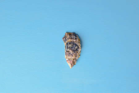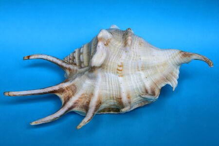 A large seashell lies on a blue background. A place for Kopi space.Horizontal orientation