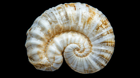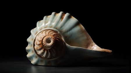 Studio close-up photo of a striking brown and white striped spiral Melongena seashell against a pure black background. Perfect for nature, ocean, or decorative themes