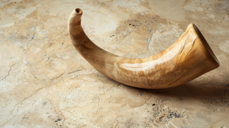 A polished shofar horn lays on a marble surface, ready for use in a religious ceremony. The horn is a traditional symbol of Jewish faith, and the marble represents the beauty and purity of the ritual.