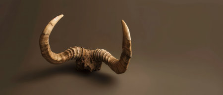 A large, curved animal skull with two long, spiraling horns rests on a brown surface. The skull is centered in the image and occupies most of the frame. The background is a solid brown color, with minimal light casting shadows behind the skull.