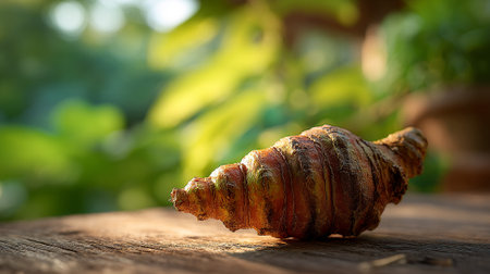 Exotic Turmeric Rhizome Resting on Rustic Wood Surface with Soft Natural Light