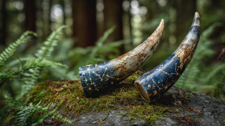 Carved horns rest on a mossy rock surrounded by lush greenery in a tranquil forest capturing the magic of twilight.