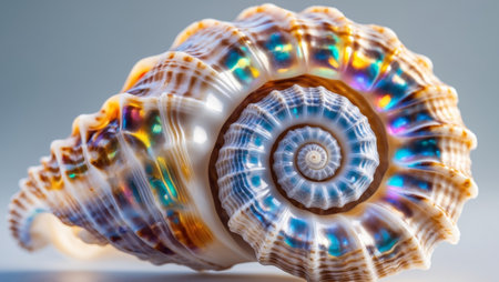 A close-up captures a pristine conch shell, its pearlescent surface reflecting light. The shell exhibits a textured exterior with a prominent spiral. Soft shadows define the form against a neutral background. This image is suitable for various commercial uses, including website design or editorial content.