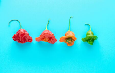 Colored peppers in a row on a blue background. Space for top and bottom copy.