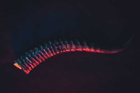 Cinematic Dutch angle photograph of an ancient, dusty Shofar horn under harsh sunlight and deep shad