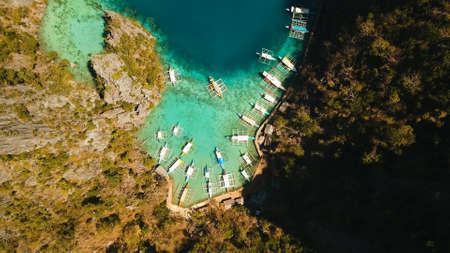 Aerial view tourist boats in lagoon. Kayangan Lake. lagoons, mountains covered with forests.coves with blue water among the rocks. Seascape, tropical landscape. Palawan, Philippines