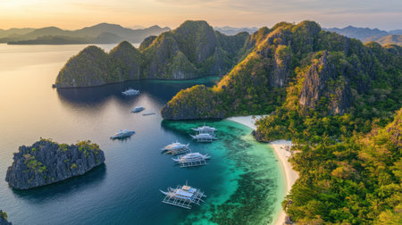 This breathtaking aerial view captures a tropical paradise at sunset, showcasing lush islands, clear waters, and peaceful boats, perfect for travel inspiration.