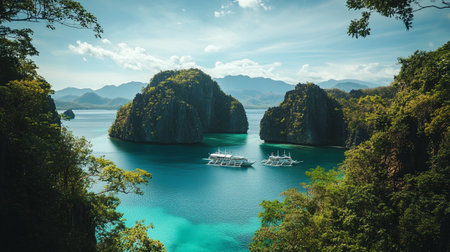 Discover a tranquil tropical paradise featuring crystal-clear water, lush green cliffs, and anchored boats, creating a serene landscape ideal for nature lovers and travelers seeking adventure.
