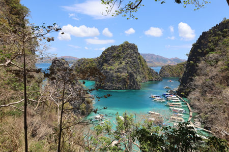Beautiful Kayangan Lagoon Docking Area, turquoise water surrounded with mountains and spider shape boat (paraw) are kept in docking area. Photo is taken from the View Point in El Nido, Philippines