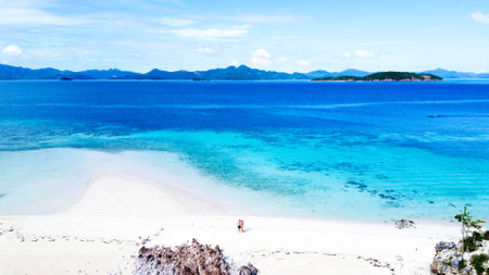 Aerial view of a couple in a pristine sandy in front of paradise blue water. Philippines sea in idyllic coastline.