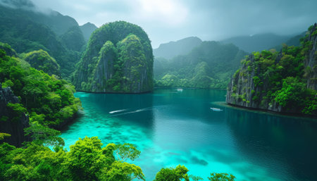 Explore a breathtaking tropical lagoon featuring vibrant blue waters, lush greenery, and majestic cliffs. A tranquil boat gently floats in this idyllic scene, perfect for relaxation.