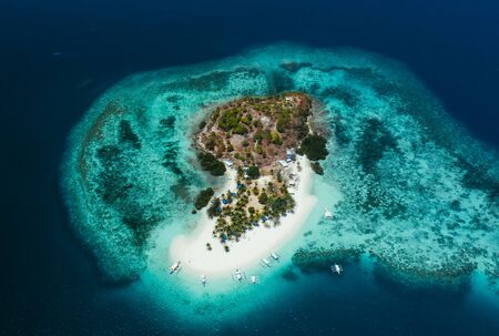 aerial view island with tropical sandy beach and palm trees. Malajon Island, Philippines, Palawan. tourist boats on coast tropical island. Summer and travel vacation concept. beach and blue clear sea water