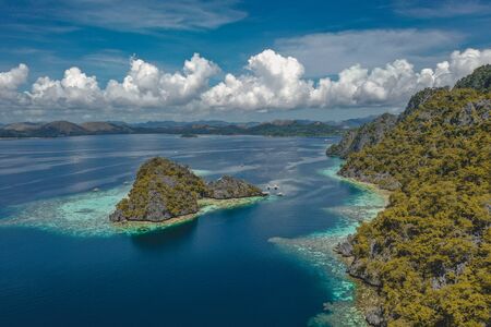 tropical island with coral reefs. Philippine Islands in clear weather aerial view. Philippines, Palawan