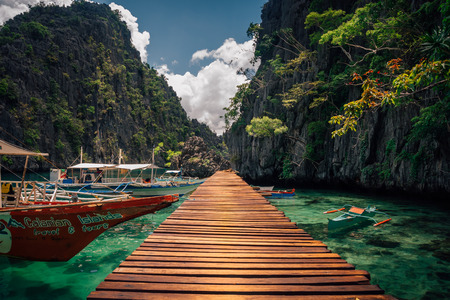Traditional boats at a wooden pier in Coron island, twin lagoon, Philippines